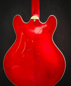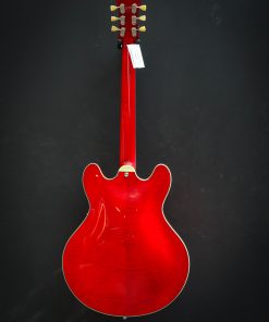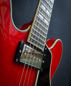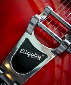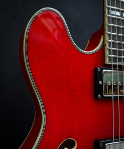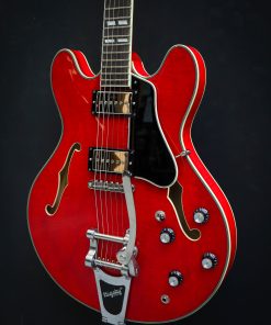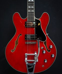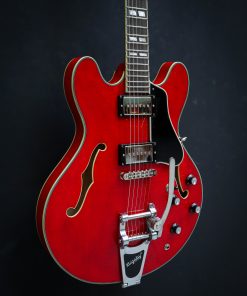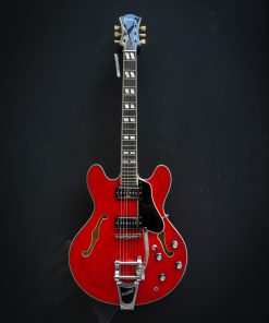 Featuring a laminated maple body, this semi-hollow is versatile, responsive, with plenty of volume and a healthy amount of power. This electric guitar has that signature humbucker sound, delivered by the Seymour Duncan Phat Cat pickups. The center block prevents excessive feedback and brings this semi-hollow a little closer to a solid body guitar with a Bigsby Licensed Vibrato B70.The cherry red finish is nicely complemented by the ivoroid bindings and the split parallelograms and provide a classic look.The Eastman guitar has a comfortable hand-filling neck profile and a nice width that makes it easy to find any position on the ebony fingerboard. Comes in a luxury case including certificate of authenticity.Brand New
